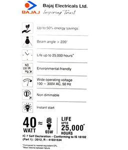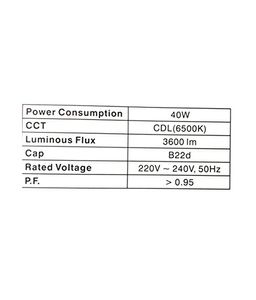 40 W LED ~ Equivalent to 65 W CFLWith 2.5 KV Voltage Surge ProtectionCCT - CDL(6500k)Luminous- 3600 LMCap : B22d, PF >0.95 --- Two Year Warranty |