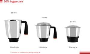 | Sales Package | Mixer Grinder with Attached 3-pin Power Cord, 3 Jars with Matched Blades (1.5L Liquidizer, 1.2L Grinder and 0.4 Chutney) and 2 Jar Lids |