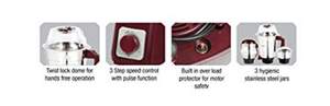 | Other Features | Cord Winder for Easy Storage, Big Speed Control Knob for Easy Usage, Break Resistant Polycarbonate Lids in Blending Jars, Flow Breakers in Jars for Better Grinding / Liquidizing, 3 Hygienic Stainless Steel Jars, Twist Lock Dome |