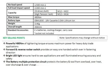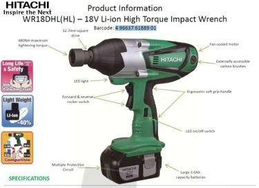 | feature | For 12.7mm (1/2") square bit shankPowerful tightening/loosening torque 480Nm (4,250in.-lbs.) in comparison with Hitachi cordless impact wrenchesHigh capacity 4.0Ah Lithium-ion battery provides longer runtime per charge than 3.0 Lithium-ion battery |