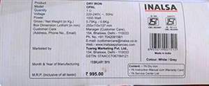 Inalsa Opal 1000W Dry Iron Specifications