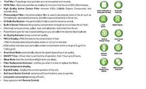 Combined HEPA / Carbon /photocatalyst Filter ; Ideal for Room size- 270-300 sq. feetRemovable Washable Dust FilterPM2.5 Air Quality IndicatorUV Light for sterilizationIonizer for fresh air |