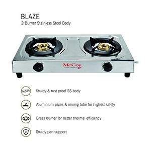 • Sturdy & Rust Proof High Grade Stainless Steel Body• Aluminium Pipes & Mixing Tube for Higher Safety• Brass Burner for Better Thermal Efficiency• Sturdy Pan Support• Customer Care No.: 1800 22 0276 (Toll Free Number) customercare@mccoyindia.in Monday to Saturday (10 AM - 7 PM) except public/national holidays. |