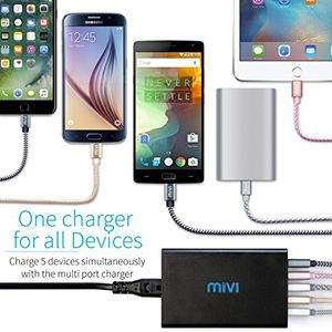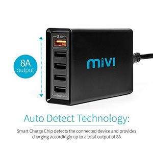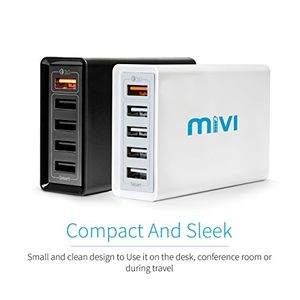 feature One Charger for all charging needs: With the 5 port Mivi Desktop charger, charge all your power hungry devices in one go be it phones, tablets, power banks or any other accessoriesQuick charge(TM) 3.0: Qualcomm® certified Quick charge(TM) 3.0 port provides 4 times faster charging than regular chargersSmart charge ports: 4 smart charge ports detect the connected device and provides the fastest possible charging up to 5A for all non quick charge devicesAll Round Safety: Built-in Temperature, Volt