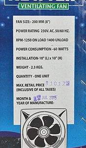 Newtek KE-20L 200mm Ventilating Fan Specifications