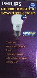 Pack of 6Warranty: 1 year on product from date of invoiceWattage: 4 watts; Operating Voltage: 220-240 voltsIncludes: 6 LED BulbsLow energy consumption and non-dimmableLifetime of 15,000 hours and UV and IR free lightUp to 40 percent energy saving (compared to CFL)Up to 85 percent energy saving (compared to GLS) |