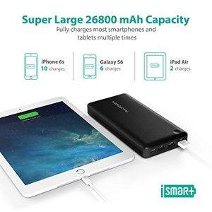 Mind-boggling Capacity: 26800 mAh of pure energy - charge an iPhone 6 Plus or Galaxy S6 over six times or an iPhone 6 ten whole times5.5A Highest Output Charging: Three USB ports with a combined 5.5A output means you can swiftly and simultaneously charge three devices at once. Plug in and instantly charge - no buttons or on-switch requiredRapid Input Charging: DC 5V 2A input (2A charger not included), twice as fast as normal 5V 1A input power banks, saving 50% of your timeExclusive iSmart Techno |