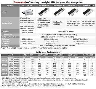 | Included Components | JetDrive 420 MacBook Pro/MacBook/Mac mini SSD, External USB 3.0 Aluminum Housing (Fully compatible with SuperSpeed USB 3.0 & Hi Speed USB 2.0), Free download of JetDrive Toolbox SSD monitoring software, USB 3.0 Cable, Travel Pouch, Quick Installation Guide, Warranty Card, MacBook Pro 5 |