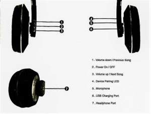 | Controls | Power On/off, Volume UP/Next Song, Volume UP/Previous Song, Device pairing LED indication, Microphone, USB Charging Port, Headphone 3.5 mm Port |