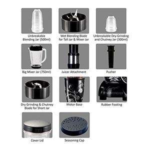 | Sales Package | Machine(1 unit),Big Mixer Jar (750ml)(1 unit),Blending Jar (500ml)(1 unit),Dry-Grinding and Chutney Jar (300ml)(1 unit),Chopper(1 unit),Cover Lid(1 unit),Juicer Attachment(1 unit),Pusher(1 unit),Wet Blending Blade for Tall Jar & Mixer Jar(1 unit),Dry Grinding & Chutney Blade for Short Jar(1 unit),Seasoning Cap(1 unit) |