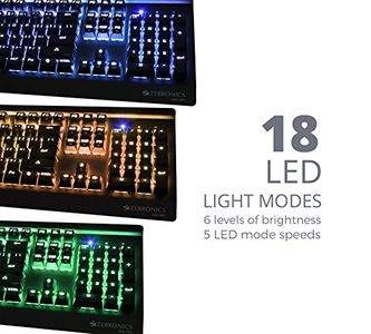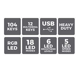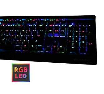 | feature | Full size mechanical keyboard, LED on/off switch, Bottom rubber gripComfortable switch tactile feeling , Heavy duty, Retractable standRGB LED backlight with pre-programed 18 LED modes, Braided cable6 levels of brightness and 5 LED mode speedsIntegrated media control |