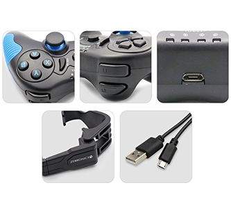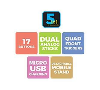 | feature | Ergonomic and comfortable designPhone mount includedTotal 17 buttonsDual analog sticks & Dual vibration motorsQuad front triggers |