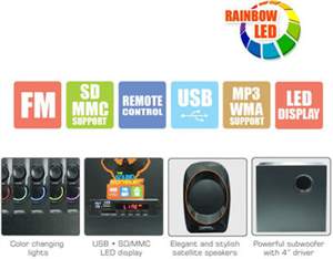 | Other Features | Support SD/MMC Memory Cards, Supports MP3 and WMA File Format, Woofer Size: 157 x 249 x 240 mm, Satellite Size: 90 x 138 x 76 mm, Satellite Driver Unit: 3 inch x 4, S/N Ratio: 80 dB, Separation: 45 dB, Total Output Power: 35 W, Frequency: 50/60 Hz |