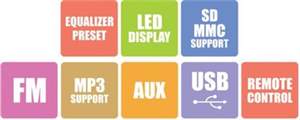 | Other Features | LED display • Supports USB & SD memory devices • Supports Mp3 file format • Built-in FM • Full function remote control • Stylish design |